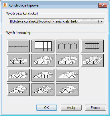 Opcja służy do wyboru/definiowania typowych konstrukcji (elementów konstrukcji). Opcja dostępna jest w menu tekstowym jak i ikonowym: po naciśnięciu ikony Konstrukcja biblioteczna
