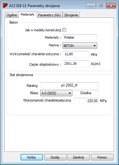 Na karcie Materiały można zdefiniować podstawowe parametry materiałów używanych w wymiarowanym elemencie konstrukcji żelbetowej.