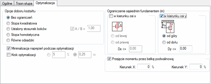 Na karcie Optymalizacja znajdują się opcje umożliwiające dobór kształtu i wymiarów projektowanego fundamentu.