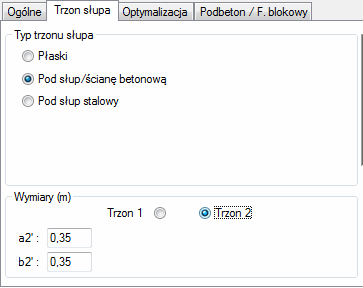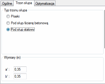 Jeśli na karcie Ogólne jest zaznaczona opcja Stopy pod dwa słupy, zmieni się zawartość pola Wymiary. Można wtedy określić wymiary połączenia słup/stopa oddzielnie dla każdego filaru. W polu Wymiary dostępna jest opcja umożliwiająca określenie wymiarów geometrycznych odrębnie dla każdego z trzonów.