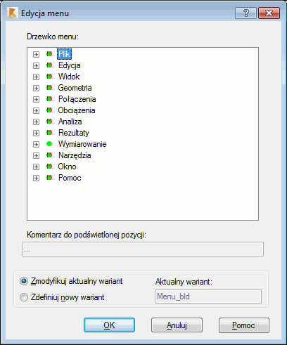 W powyższym oknie dialogowym można dokonać edycji aktualnego wariantu menu lub utworzenie całkiem nowego menu.