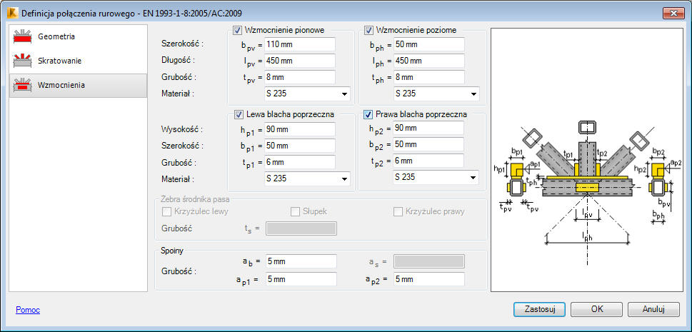 W dolnej części okna dialogowego zdefiniowana może zostać grubość spoin wzmocnień.