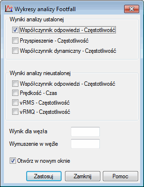 Szczegółowe wyniki w postaci wpływu oddziaływania wymuszenia z jednego węzła na inny (full excitation) lub też oddziaływanie wymuszenia węzła na samego siebie (self excitation) będą prezentowane na wykresach. Opcja dostępna w menu Wyniki > Zaawansowane > Analiza footfall — Wykresy.