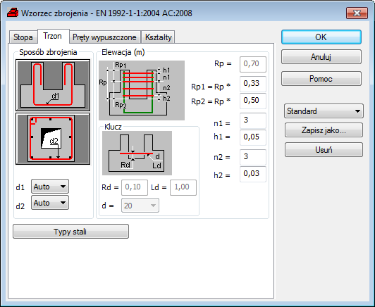Wybierz podstawowe kształty zbrojenia i średnice wkładek pionowych i poziomych. Po określeniu podstawowego kształtu zbrojenia użytkownik ma możliwość wskazania (na karcie Kształty) konkretnego kształtu wkładki (zarówno pionowej — zbrojenie kielichów, jak i poziomej — strzemię), jaka ma być użyta do zbrojenia. Jeżeli średnice d1 i d2 przyjmują wartość auto, to program dobiera średnice stosownie do zdefiniowanych rozstawów oraz w zależności od działającego obciążenia.