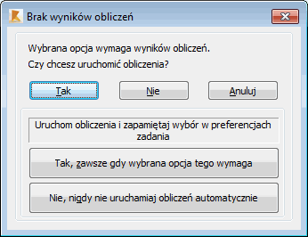 Opcje, które wymagają wyników, to tabele z wynikami oraz okna dialogowe służące do wyboru wyświetlanych wykresów i map. Przed uruchomieniem obliczeń zostanie wyświetlone następujące okno dialogowe: