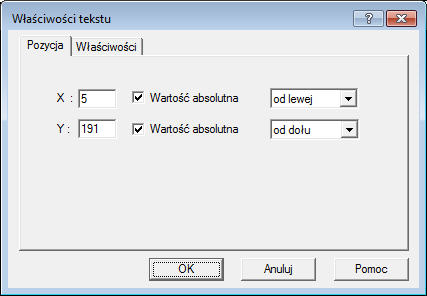 Okno dialogowe składa się z dwóch kart: Położenie i Właściwości. Rysunek poniżej przedstawia kartę Położenie w oknie dialogowym Właściwości tekstu.
