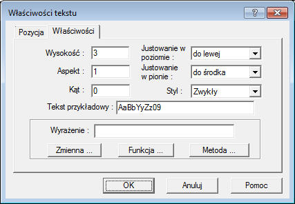 Rysunek poniżej pokazuje właściwości, na karcie Tekst, w oknie dialogowym Właściwości.