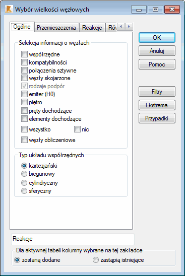 Po wybraniu karty Ogólne w oknie dialogowym Wybór wielkości węzłowych na ekranie pojawi się pokazane poniżej okno dialogowe, w którym prezentowane będą wartości należące do węzłów konstrukcji.