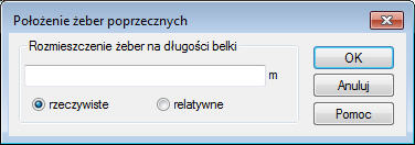 W oknie dialogowym powyżej, użytkownik może określić dystrybucję usztywnienia wzdłuż długości belki (jest wyrażana w rzeczywiste współrzędne lub w współrzędne względne, z uwzględnieniem długości belki).