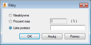 Okno dialogowe Filtry służy do określania liczby postaci branych pod uwagę podczas analizy dynamicznej konstrukcji. Okno to może być wywołane na ekran po wybraniu analizy spektralnej lub sejsmicznej i naciśnięciu klawisza Filtry w oknie dialogowym służącym do definicji parametrów wybranego typu analizy dynamicznej. Na ekranie pojawia się pokazane poniżej okno.