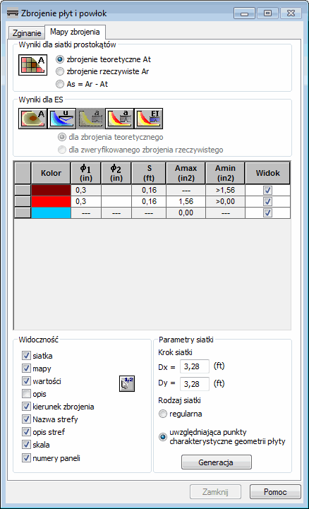 Dla zbrojenia teoretycznego — wybranie tej opcji powoduje, że mapa będzie przedstawiana dla obliczonego zbrojenia teoretycznego.