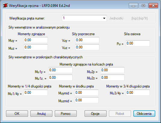 Okno dialogowe Weryfikacja ręczna służy do weryfikacji pręta stalowego dla wartości sił określonych przez użytkownika według wymogów amerykańskiej normy stalowej LRFD. Aby uzyskać dostęp do tej opcji, należy kliknąć opcje Wymiarowanie Wymiarowanie prętów stalowych — opcje