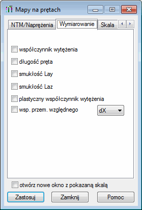 Po wybraniu karty Wymiarowanie w oknie dialogowym Mapy na prętach wyświetlane są następujące wielkości.