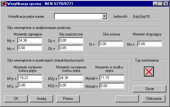 - W polu Siły wewnętrzne w przekrojach charakterystycznych wpisać wartości odpowiednich pomocniczych sił wewnętrznych (używane jednostki prezentowane są w prawym, górnym rogu okna dialogowego) potrzebnych do obliczeń normowych pręta;