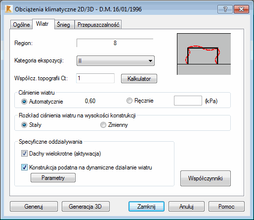 Powyższe okno podzielone zostało na kilka pól, które zawierają pewne grupy opcji. W górnej części okna znajduje się pole Region, zawierające listę regionów dostępnych dla normy klimatycznej. Dodatkowo, można określić wartości Kategoria ekspozycji i Współczynnik topografii.