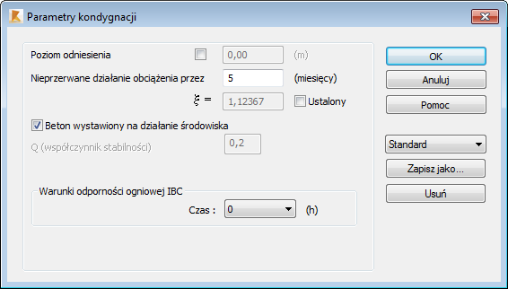 - ksi — współczynnik wykorzystywany do obliczenia ugięcia długotrwałego (ACI318/99, p.9.5.2.5); jest on obliczany automatycznie na podstawie zadanego czasu działania obciążenia długotrwałego; może być zadany ręcznie po włączeniu opcji Ustalony i wpisaniu wartości współczynnika.
