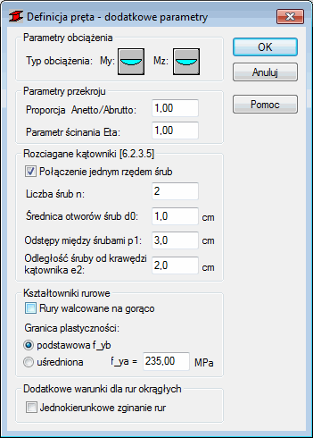- Warunki w przypadku okrągłych rur. Jeżeli opcja Jednokierunkowe zginanie rur jest włączona, to dla tego typu przekroju wyznaczany jest moment zginający będący sumą momentów działających wzdłuż osi Y i Z; ten wypadkowy moment jest podstawą do wymiarowania prętów.