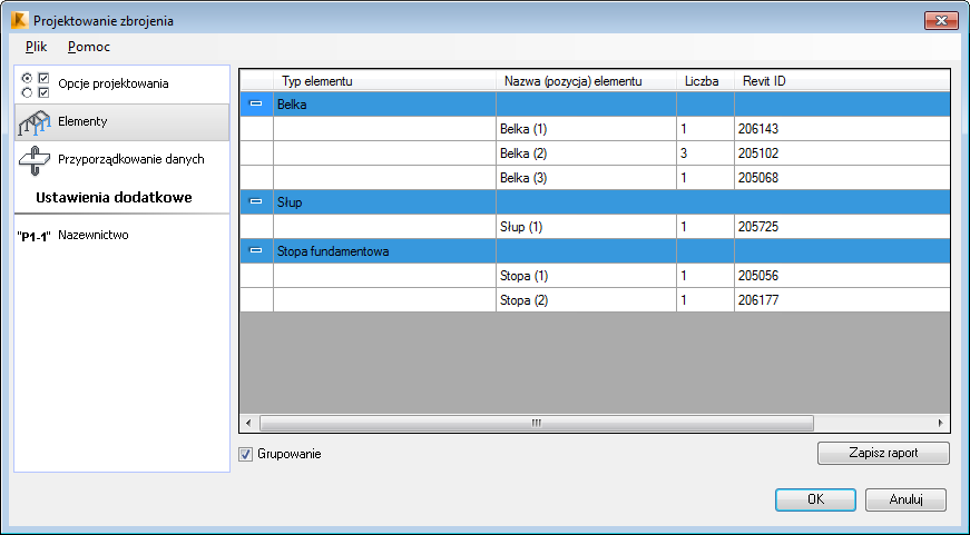 Zakładka Elementy zawiera listę wybranych elementów obsługiwanych przez moduł (betonowe belki, słupy i stopy fundamentowe). Elementy są pogrupowane według typu (trzy główne grupy: belki, słupy i stopy fundamentowe), parametru Znacznik wystąpienia rodzin programu Revit, geometrii elementów (długość, kształt i wymiary) i parametrów zbrojenia. Można także anulować zaznaczenie opcji Grupowanie. Wszystkie elementy traktowane są oddzielnie. Liczba projektów żelbetowych w programie Robot jest równa liczbie wybranych elementów w programie Revit.