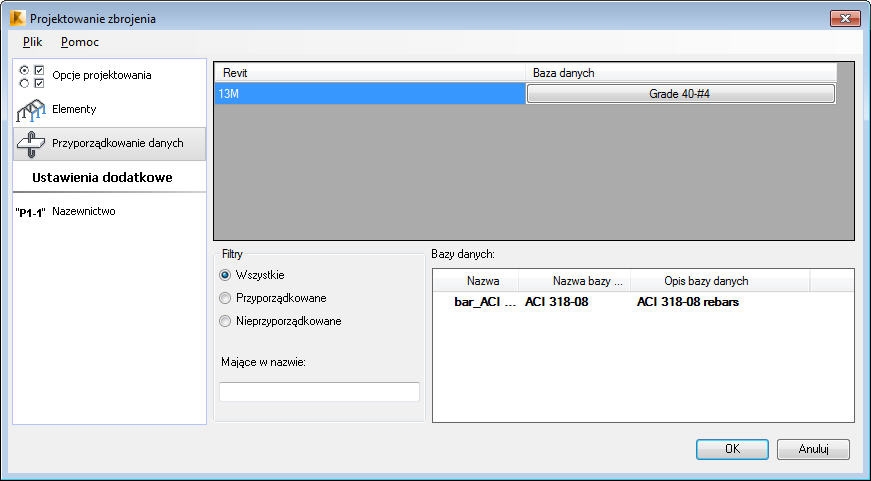 W tej zakładce można przypisać klasę stali i średnice do prętów zbrojeniowych, które są eksportowane z programu Revit do programu Robot. Jest to istotne podczas korzystania z różnych list prętów zbrojeniowych w programach Revit i Robot.