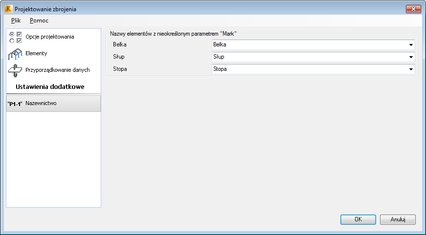 Zakładka Nazewnictwo jest dostępna dla trybów wymiarowania i weryfikacji. Ma ona zastosowanie jedynie do elementów, dla których parametr Znacznik nie jest zdefiniowany. Służy do definiowania przedrostka nazwy dla elementów żelbetowych programu Robot.