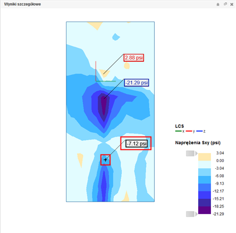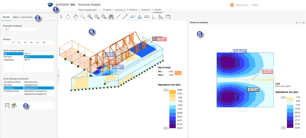 Przeglądaj wyniki szczegółowe. Umożliwia to wyświetlenie wartości ekstremalnych dla wybranego typu wyniku, map (w przypadlu elementów powierzchni) i wykresów (w przypadku prętów) dla elementu wybranego w widoku 3D (4). Można również wyświetlić wartości wyników w wybranych punktach.