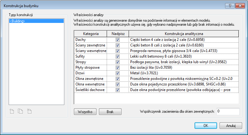 Uwaga: Przypisane Konstrukcje analityczne są używane w analizie energetycznej, niezależnie od ustawień parametru Eksportuj wartości domyślne w oknie dialogowym Ustawienia energii.