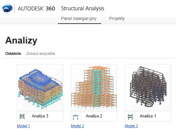 Autodesk® 360 Structural Analysis jest otwierana domyślnie na karcie Panel nawigacyjny. W tym miejscu można wyświetlić analizy wykonywane ostatnio i analizy udostępnione użytkownikowi. Ikona obok nazwy analizy wskazuje typ analizy: