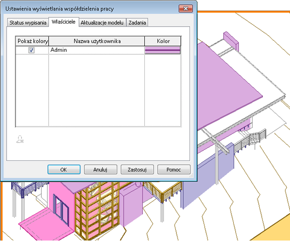 Ustawienia wyświetlania współdzielenia pracy. Określony kolor dla odpowiedniego właściciela zostanie wyświetlony w modelu.