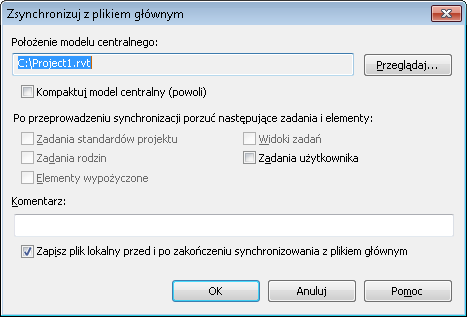 | Efekt: Można użyć okna dialogowego Synchronizuj z modelem centralnym do wyszukania innego modelu centralnego. | Efekt: Przycisk Przeglądaj nie jest dostępny w oknie dialogowym Synchronizuj z modelem centralnym i nie ma możliwości zmiany nazwy i lokalizacji modelu centralnego. |
