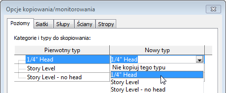 Uniemożliwić kopiowanie przez program Revit elementów pewnego typu Odszukaj typ elementu w kolumnie Pierwotny typ. W tym samym wierszu, w kolumnie Nowy typ wybierz opcję Nie kopiuj tego typu.