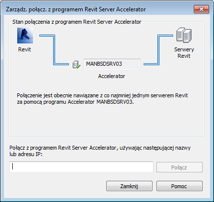 Przy użyciu tej procedury można sprawdzić stan połączenia z programem Accelerator, który został przypisany do danego położenia (określonego w systemowej zmiennej środowiskowej RSACCELERATOR2016) i w razie konieczności wybrać inny program Accelerator. Jeżeli połączenie sieciowe z programem Revit Server Accelerator zostanie utracone lub użytkownik zdecydował o niekorzystaniu z tego programu, zostanie on bezpośrednio połączony z serwerami Revit Server.