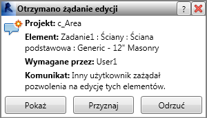 Powiadomienia wyświetlają się przez około 30 sekund. Po tym czasie można użyć okna dialogowego Żądanie edycji, aby sprawdzić stan obsługi żądań i zareagować na żądania członków zespołu.