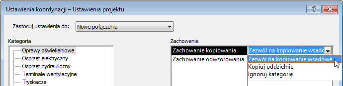 Przed skopiowaniem osprzętu z modelu podłączonego do projektu MEP lub w trakcie tego procesu określ zachowanie kopiowania w odniesieniu do każdej kategorii osprzętu w oknie dialogowym Określ ustawienia koordynacji.