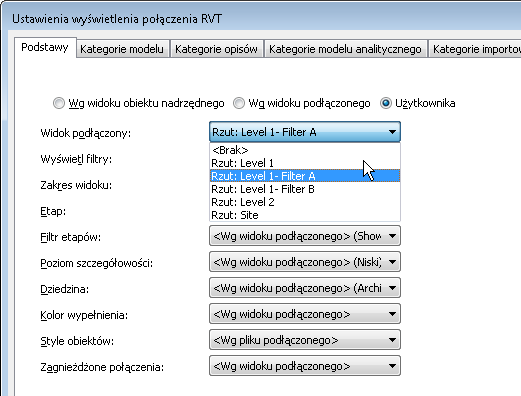 3. W polu Widok podłączony wybierz widok w modelu podłączonym, którego ustawienia wyświetlania mają być użyte dla modelu podłączonego w aktualnym widoku obiektu nadrzędnego.
