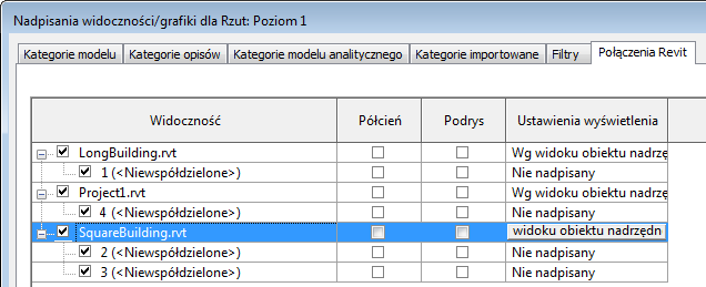 Parametry sterujące widocznością i grafiką podłączonych modeli programu Revit są zgrupowane na specjalnej karcie Połączenia Revit w oknie dialogowym Widoczność/Grafika.