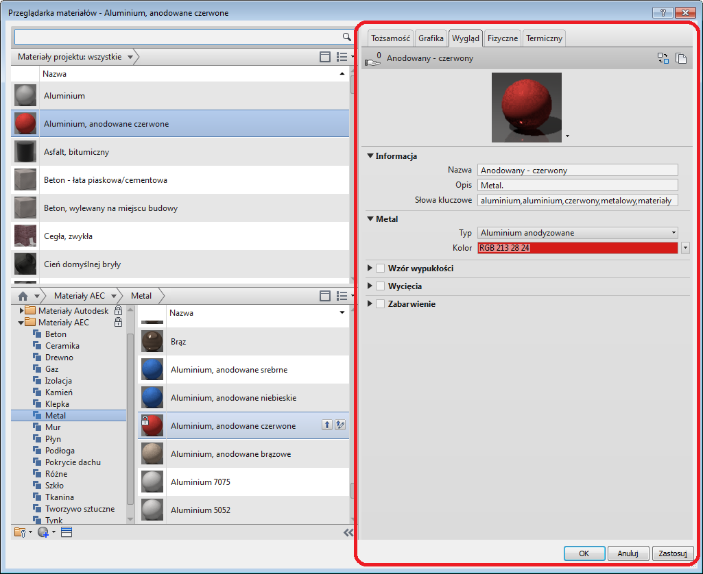 W Przeglądarce materiałów te informacje są wyświetlane na kartach Identyfikacja, Grafika i Wygląd w panelu Edytor materiałów.