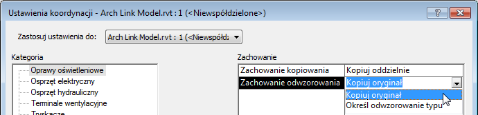 Przed skopiowaniem osprzętu z podłączonego modelu do projektu MEP lub w trakcie tego procesu określ zachowanie odwzorowania do każdej kategorii osprzętu w oknie dialogowym Określ ustawienia koordynacji.