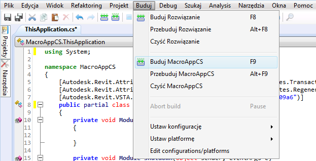 - W środowisku Revit macro IDE z listy rozwijanej wybierz opcję Build charakterystyczną dla makra.