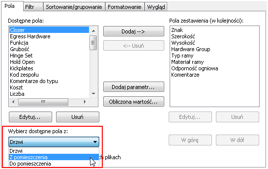 Uwzględnianie informacji o pomieszczeniu w zestawieniu drzwi