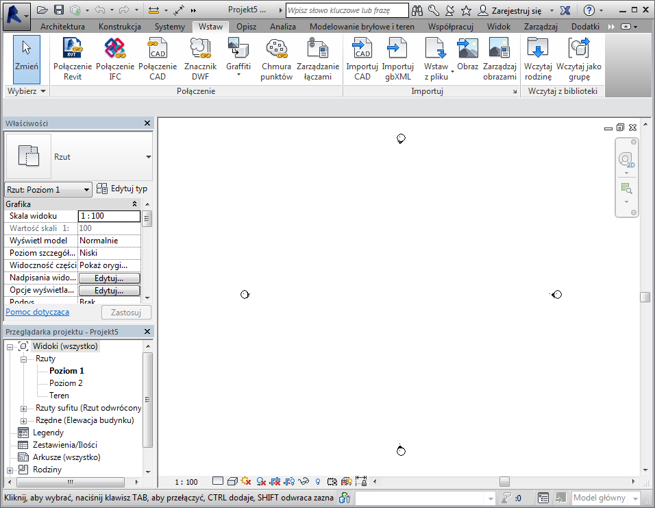 Obszar rysunku przedstawia widoki (oraz arkusze i zestawienia) bieżącego projektu. Widok otwierany w projekcie jest zawsze wyświetlany domyślnie w obszarze rysunku na wierzchu pozostałych otwartych widoków.