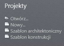 W oknie Poprzednie pliki w polu Projekty może znajdować się do 5 szablonów. Szablon projektu stanowi punkt wyjścia do nowego projektu. Umożliwia definiowanie ustawień, nadawanie stylów oraz dostarcza podstawowych informacji. Szablony upraszczają konfigurowanie projektu, ujednolicają dokumentację i zapewniają zgodność ze standardami biura.