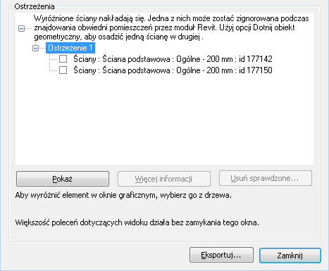 Rozwiń listę, aby wyświetlić poszczególne elementy związane z każdym ostrzeżeniem. Po wybraniu tekstu obok ostrzeżenia element zostanie podświetlony we wszystkich otwartych widokach, tam gdzie jest on widoczny.