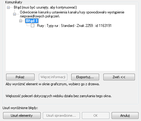 - Wybierz nagłówek komunikatu o błędzie, np. Błąd 1. Wszystkie elementy związane z tym błędem zostaną zaznaczone w obszarze rysunku.