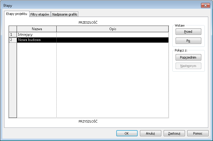 Zostanie otwarte okno dialogowe Etapy wyświetlające zakładkę Etapy projektu. Domyślnie w każdym projekcie istnieją etapy o nazwach Istniejący i Nowa budowa.