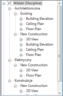 Domyślnie Przeglądarka projektu wyświetla wszystkie widoki (według typu widoku) i wszystkie arkusze (według numeru arkusza i nazwy arkusza).