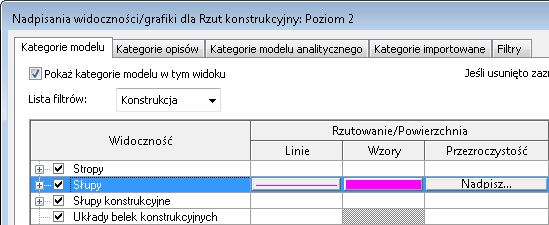 Na poniższej ilustracji kategoria Słupy ma nadpisania dla linii i wzorów rzutowania/powierzchni.
