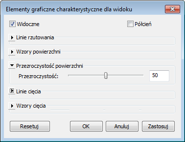 - Przezroczystość powierzchni: wyświetla linie tylko dla elementów, nie dla powierzchni. Użyj suwaka Przezroczystość, aby ustawić procent przezroczystości powierzchni.