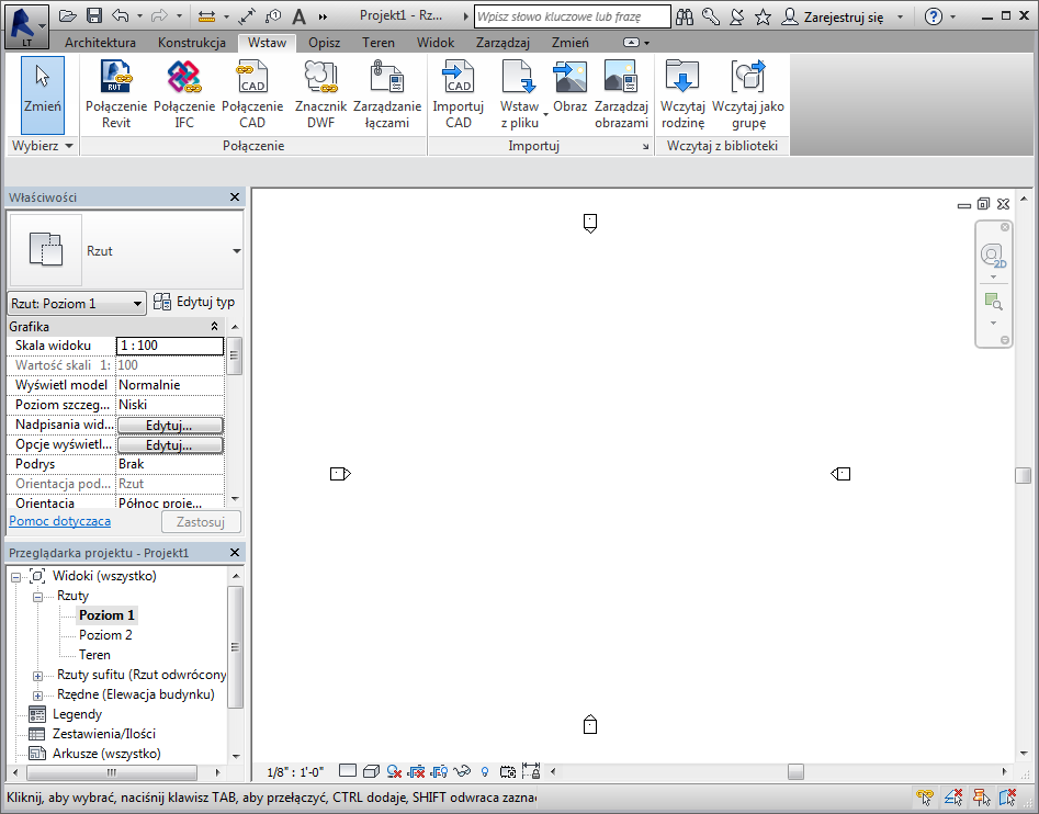 Obszar rysunku przedstawia widoki (oraz arkusze i zestawienia) bieżącego projektu. Widok otwierany w projekcie jest zawsze wyświetlany domyślnie w obszarze rysunku na wierzchu pozostałych otwartych widoków.