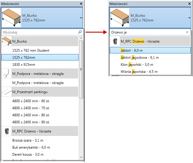 W programie Revit LT udostępniono funkcję wyszukiwania, aby ułatwić wybór z długiej listy opcji. Można wyszukiwać w następujących obszarach funkcyjnych: