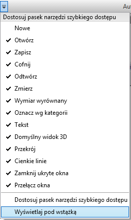 Pasek narzędzi szybkiego dostępu może być wyświetlany nad lub pod wstążką. Aby zmienić ustawienie, na pasku narzędzi Szybki dostęp kliknij kolejno listę rozwijaną Dostosuj pasek narzędzi Szybki dostępWyświetlaj pod wstążką.